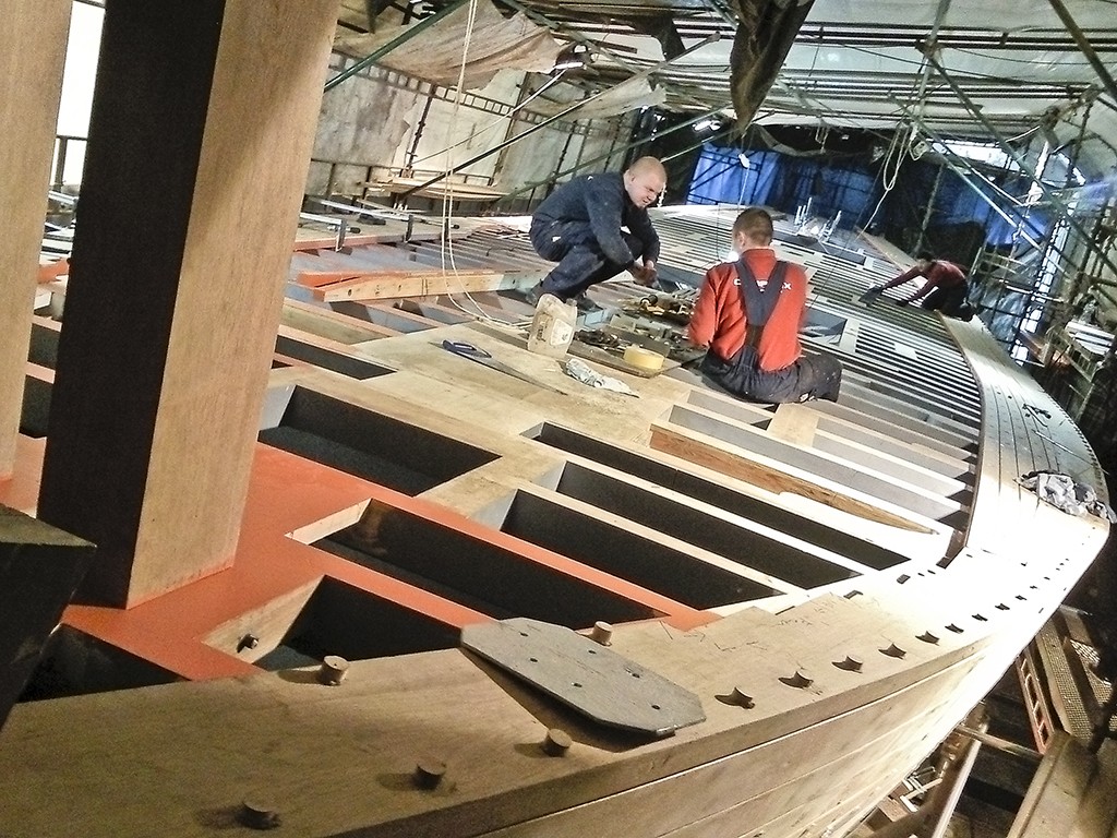 Okazję do odwiedzin jednostki mieli we środę członkowie Rady Miasta Gdańska oraz Komisji Sportu i Turystyki. Choć nie każdy pasjonuje się żeglarstwem i szkutnictwem, nabierający kształtów kadłub zrobił na gościach wrażenie, a ekipa remontowa wysłuchała wielu słów uznania dla wkładanego w to dzieło wysiłku. Także i bezanmaszt nabiera swego ostatecznego kształtu i smukłości.