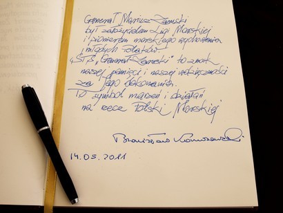 Na zakończenie wizyty Pan Prezydent dokonał wspiu do księgi pamiątkowej. Otrzymał także na pamiątkę specjalną cegiełkę z numerem 001 - fragment oryginalnej planki, a także list od Pawła Adamowicza, będący zaproszeniem do objęcia honorowym patronatem Prezydenta RP akcji odbudowy jachtu “Generał Zaruski" oraz późniejszego programu szkolenia młodzieży.