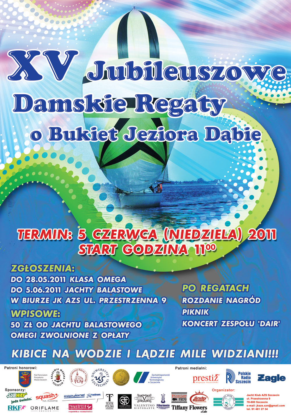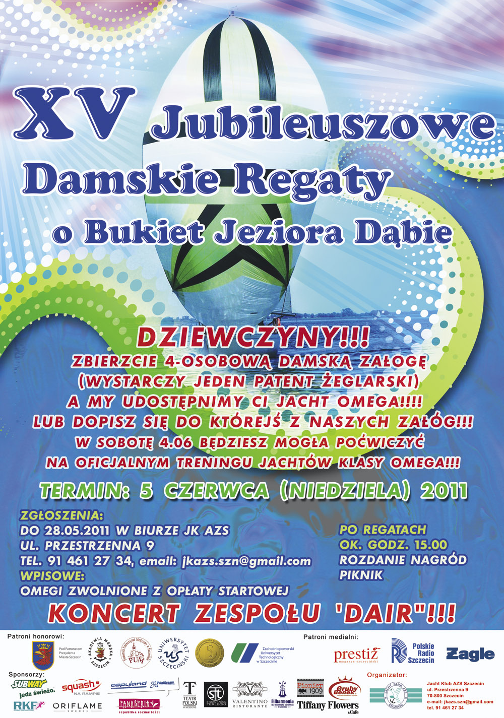 Już 5-go czerwca na wodach Jeziora Dąbie w Szczecinie odbędą się XV Damskie Regaty o Bukiet Jeziora Dąbie w których uczestniczyć będą tylko kobiety. W tym roku pewna odmiana, nie trzeba mieć własnego jachtu, można zgłosić swoją załogę a omegę udostępnią organizatorzy, zarówno na czas treningów jak i samych regat. Zgłoszenia do 28.05 a po regatach koncert zespołu Dair i piknik dla wszystkich.