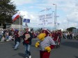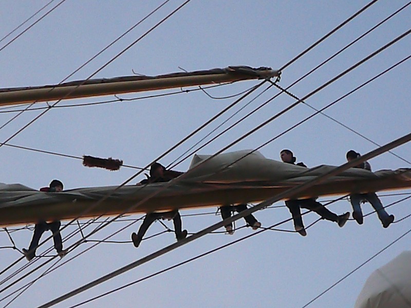 Prawdziwą furorę zrobiliśmy natomiast na mecie I etapu, w Greenock, podczas trzydniowego spotkania regatowej flotylli blisko 60 jachtów i żaglowców z całego świata. Oficjalną reprezentację Szczecina, czyli 12-osobową załogę "Daru Szczecina", wmocniła tu 22-osobowa druga nasza ekipa, zaokrętowana na pokładzie "Daru Młodzieży", razem ze studentami gdyńskiej Akademii Morskiej. Na morzu jesteśmy oczywiście jedną, wspólną załogą, nasza młodzież ma takie same obowiązki jak studenci, włączona jest do wacht, pracuje przy obsłudze żagli, na pokładzie i na rejach, stoi na sterze i na oku, itp. Trochę inaczej jest w portach, gdzie oprócz wacht portowych mamy jeszcze obowiązek i przywilej reprezentowania Szczecina, prowadzenia szzcecińskiego stoiska promocyjnego, zapraszania innych załóg i zwiedzających do Szczecina, itd. Tu razem z załogą "Daru Szczecina" stanowimy już jeden zespół, wyróżniamy się wspólnym strojem - w barwach Szczecina, organizujemy specjalne promocyjne akcje, m.in. żonglerki czy nocne pokazy ognia, zapraszamy do wspólnej zabawy inne załogi i gości, a głównym pomysłodawcą, inspiratorem i mistrzem tych wszystkich działań od dwóch lat jest niezmordowany Łukasz Wójcik, nauczyciel,