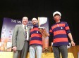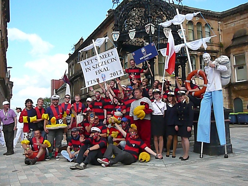artysta, magik, szczudlarz i żongler. Przygotowania i szkolenia jeszcze w Szczecinie dały dobry efekt, barwna i roztańczona połaczona reprezentacja naszego miasta, prowadzona przez "marynarza" na szczudłach, czyli Łukasza, okazała się najlepsza w paradzie ulicznej w Greenock, nie zagroziła nam nawet egzotyczna, także doskonała załoga kolumbijskiej "Glorii". Ceremonia rozdania nagród po I etapie, we wspaniałej głównej sali ratusza, po brzegi wypełnionej załogami, była "nasza", czyli polska i szczecińska. Kapitanowie obu naszych jachtów odebrali swoje nagrody za drugie miejsca w wyścigu, a cała oficjalna reprezentacja za najlepszą paradę. Potem było wspólne zdjęcie na ratuszowym placu...